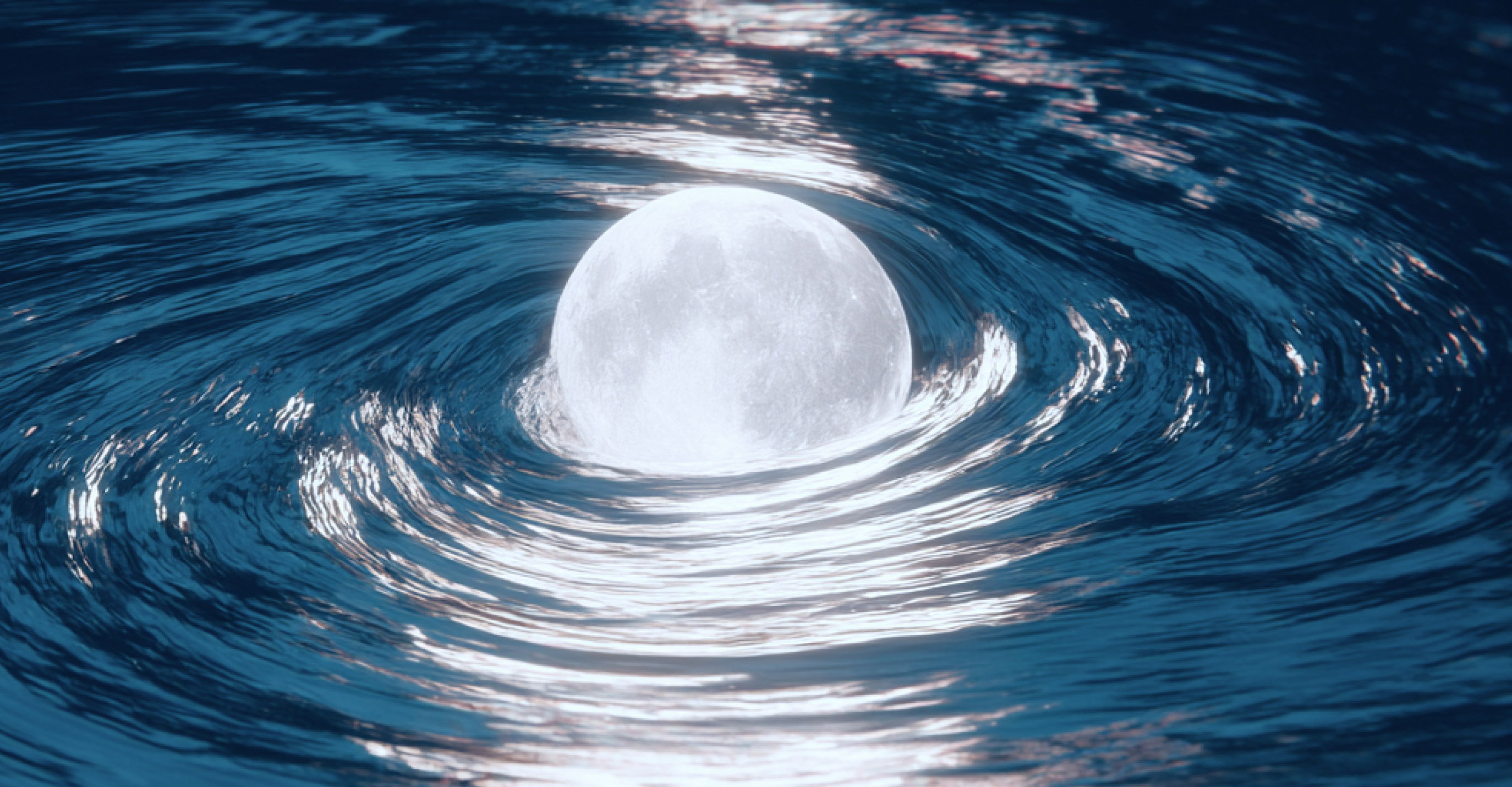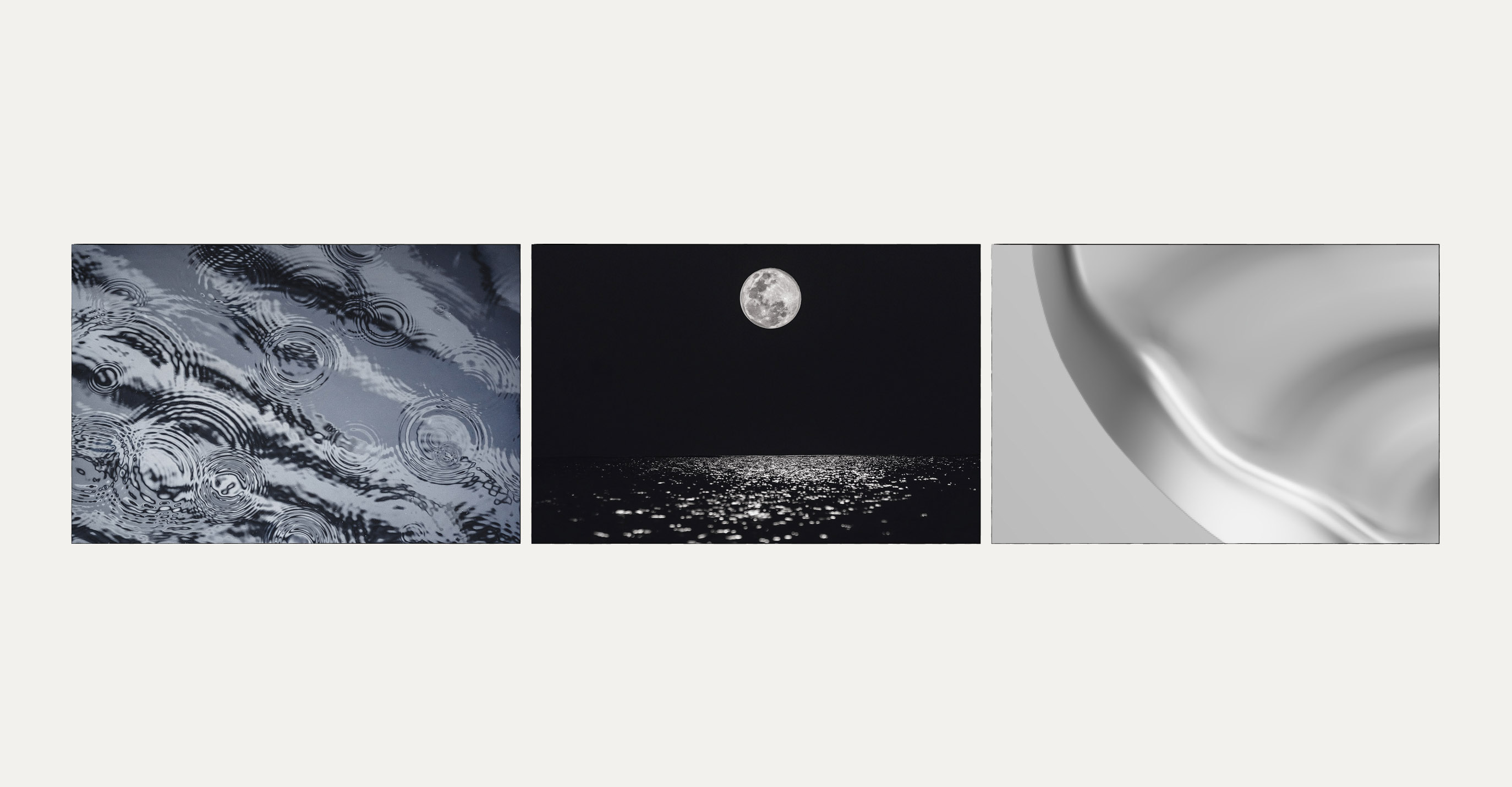 Captures the rhythm of water in motion beneath the glow of the full moon. Gentle ripples flow across the metallic surface, reflecting shifting hues of light and shadow, a dance between moonlight and water.